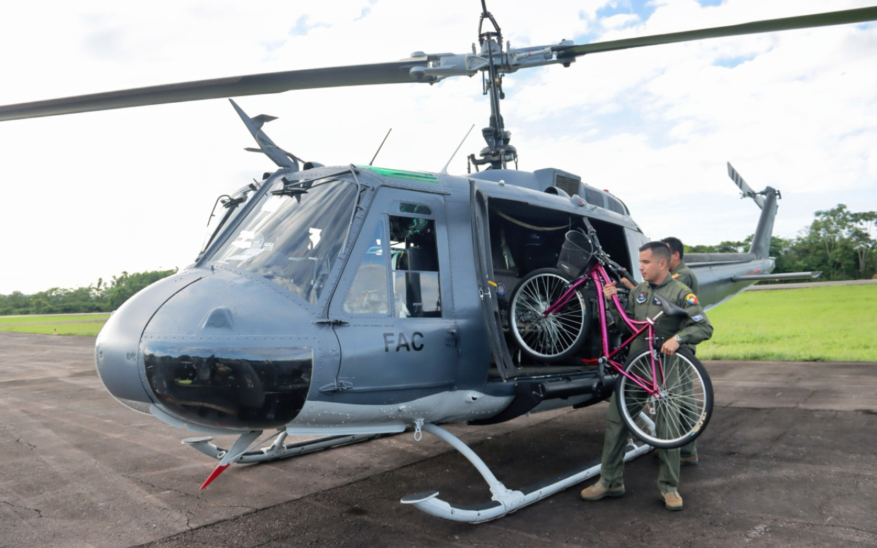 En esta actividad desarrollada con el apoyo de la Secretaría de Gobierno de Caquetá, la Alcaldía Municipal de La Montañita, la Armada Nacional y el Hospital Departamental María Inmaculada, el Comando Aéreo de Combate No. 6 realizó la entrega de una bicicleta, kits odontologícos, una silla de ruedas y ropa, contribuyendo al bienestar de las familias beneficiadas.