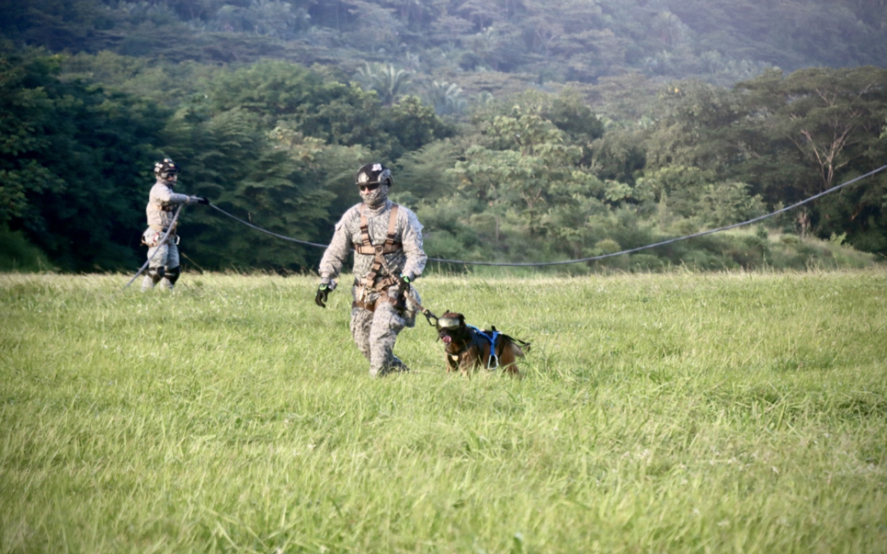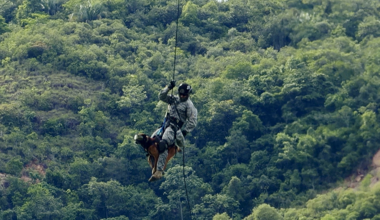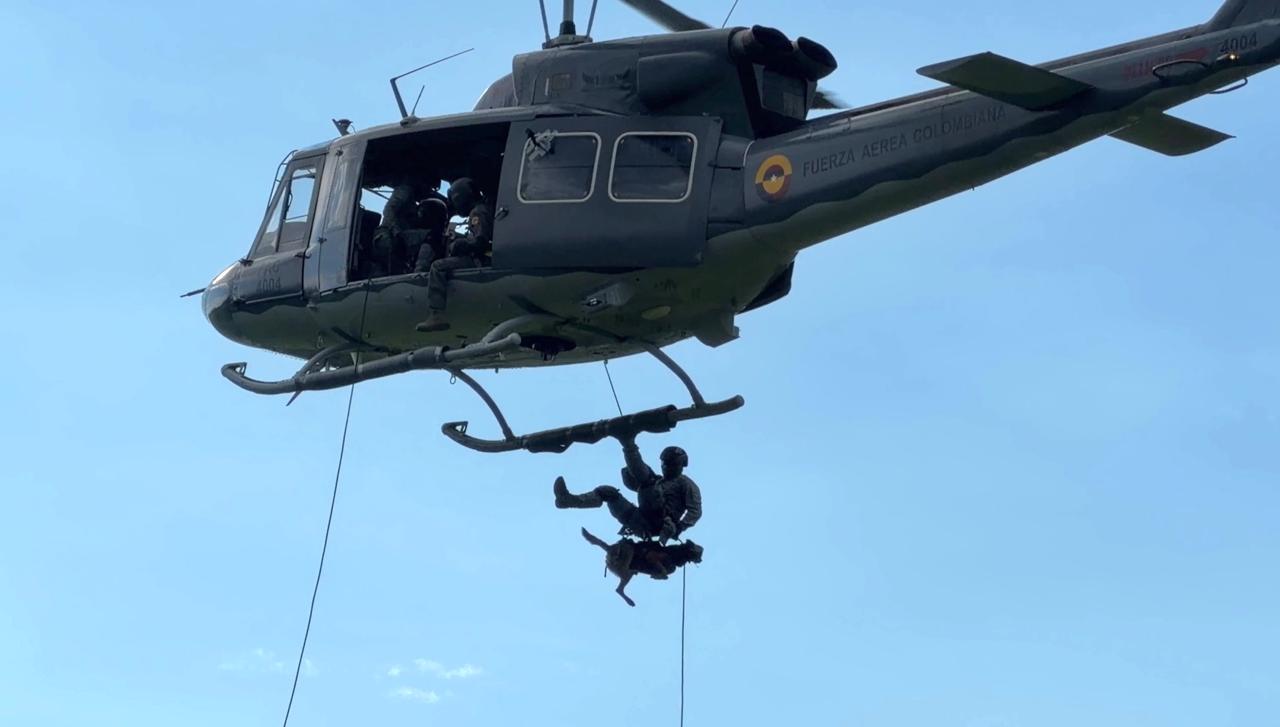 En el Comando Aéreo de Combate No. 4 se llevó a cabo una jornada de entrenamiento en la que un canino de búsqueda y rescate participó en maniobras de rappel y spies desde un helicóptero, como parte del Curso de Operaciones Especiales en el que intervinieron pilotos, tripulantes y personal de comandos de la Fuerza Aeroespacial Colombiana.
