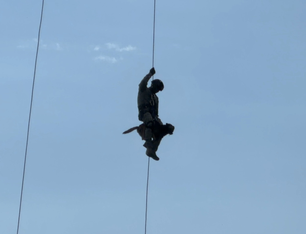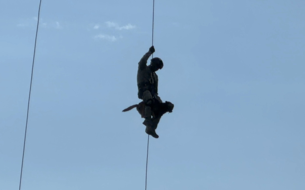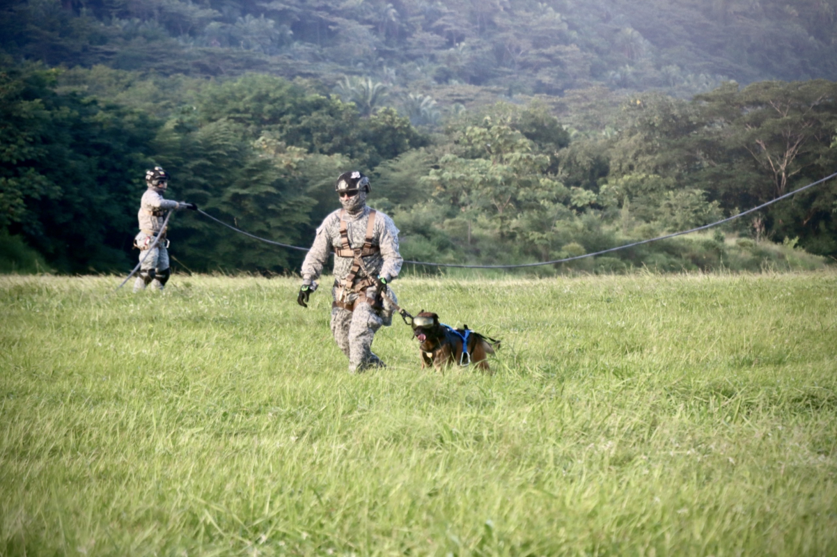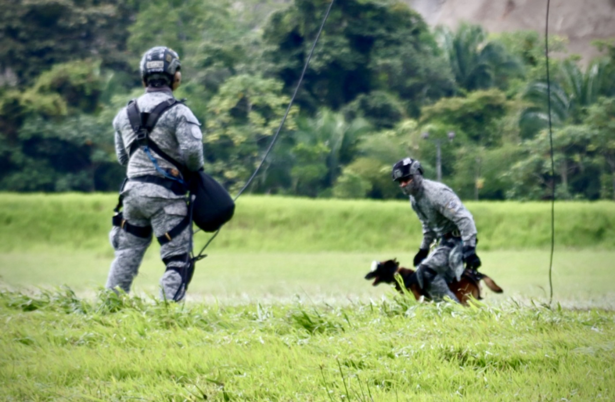 En el Comando Aéreo de Combate No. 4 se llevó a cabo una jornada de entrenamiento en la que un canino de búsqueda y rescate participó en maniobras de rappel y spies desde un helicóptero, como parte del Curso de Operaciones Especiales en el que intervinieron pilotos, tripulantes y personal de comandos de la Fuerza Aeroespacial Colombiana.
