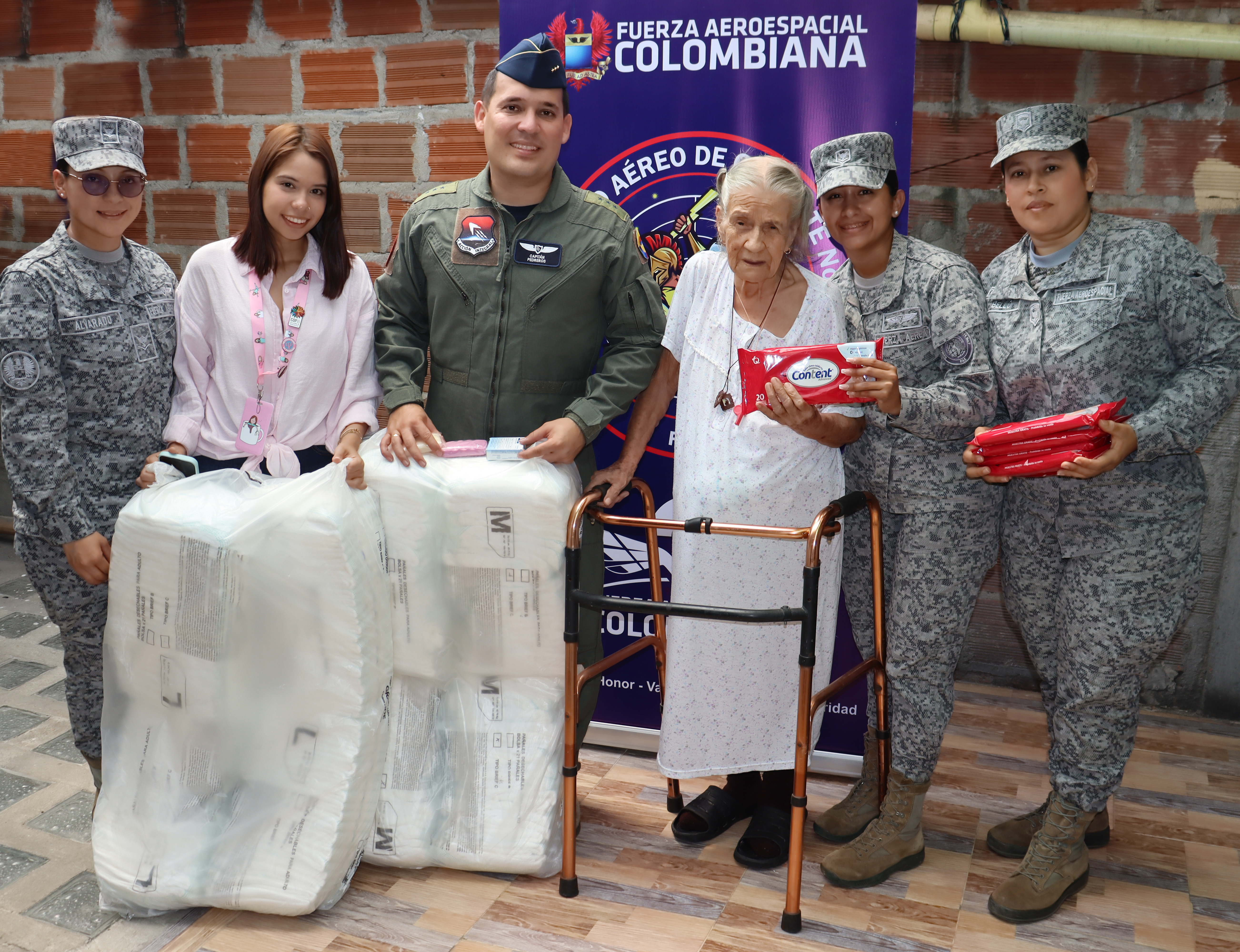 La actividad de acercamiento a la población fue liderada por la Sección de Acción Integral del Comando Aéreo de Combate No. 7, que trasladó hasta las viviendas de cuatro adultos mayores y dos personas con necesidades especiales un total de 1.272 pañales, 50 paquetes de pañitos, 12 jabones de baño y 12 cremas para hidratar o reparar la piel seca, agrietada e irritada.