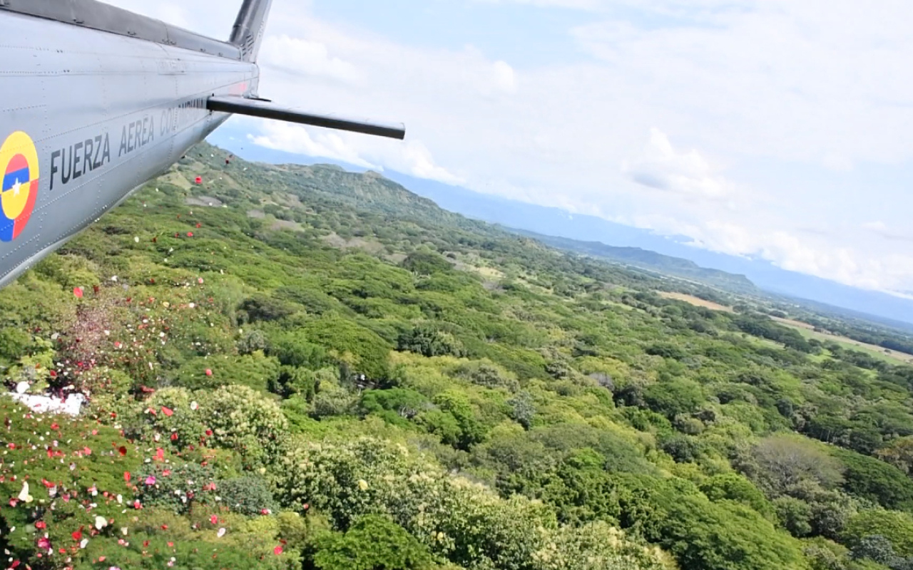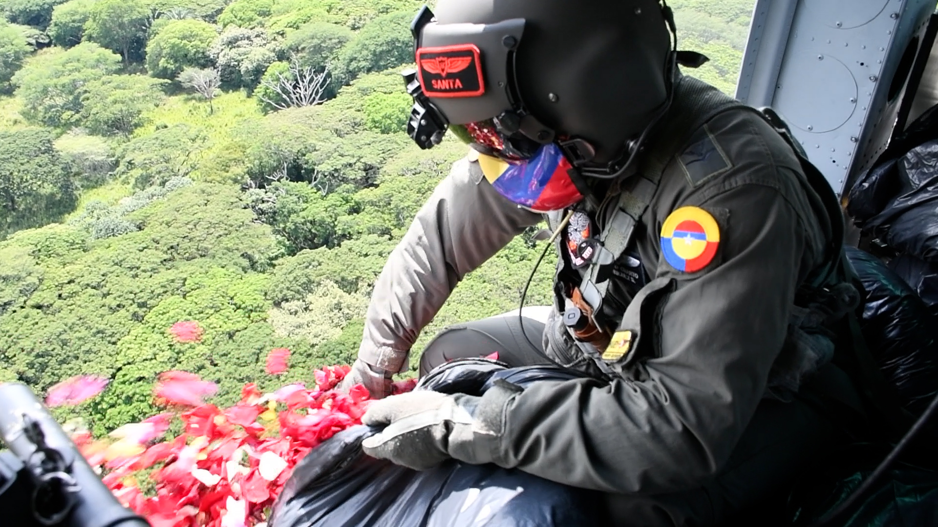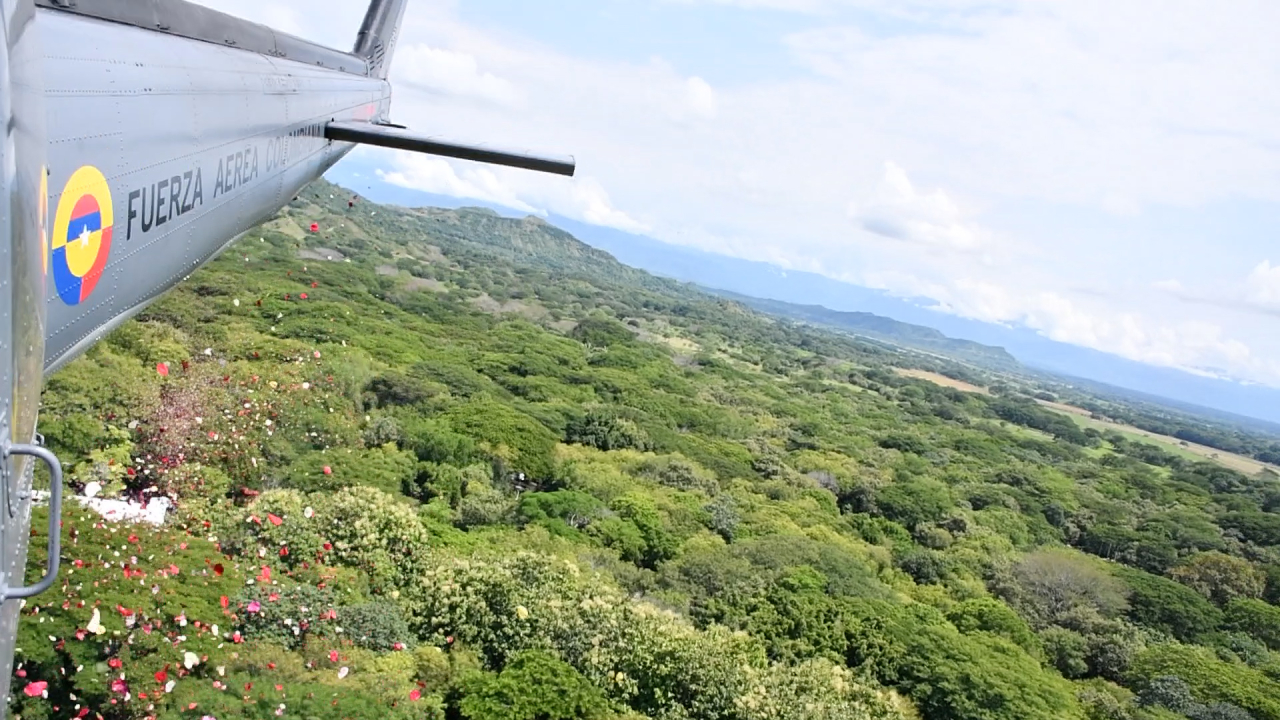 Cuarenta años después, el cielo volvió a ser testigo de un acto que mezcló dolor, memoria y esperanza, dos aeronaves tipo Huey II del Comando Aéreo de Combate No. 4 surcaron los cielos de lo que alguna vez fue Armero, dejando caer miles de pétalos rojos que descendían como un susurro, como un abrazo que llega desde lo más alto para tocar heridas que nunca terminan de sanar.