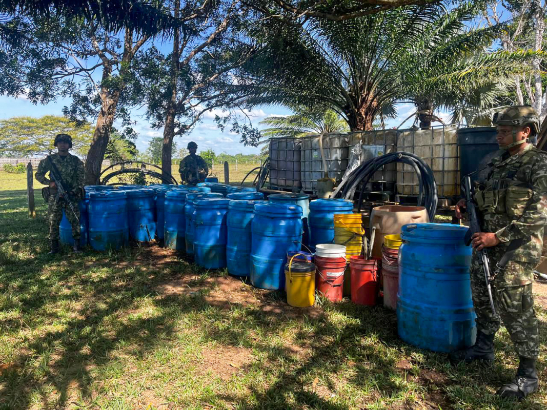 En el lugar fue hallada una infraestructura artesanal en madera de aproximadamente 12 por 16 metros, con techo en zinc y plástico, además de una importante cantidad de insumos y materiales químicos como; permanganato de potasio líquido y en polvo, recipientes con ácido clorhídrico, urea, tanques con combustible tipo ACPM, tanques plásticos de diferentes capacidades y metros de manguera industrial, los cuales fueron inutilizados y destruidos de manera controlada.