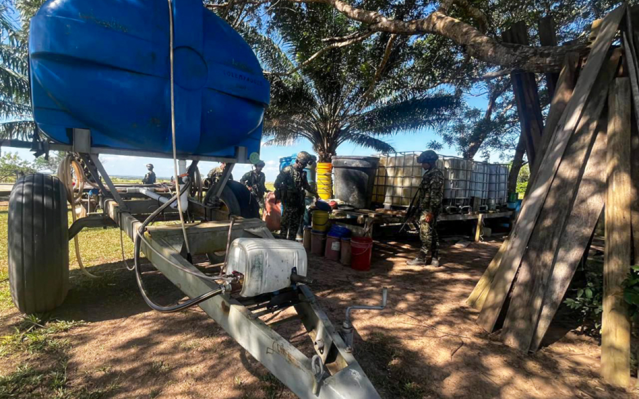 En la inspección de Guanape, municipio de Cumaribo, departamento del Vichada, fue ubicado y destruido un laboratorio artesanal destinado a la producción de permanganato de potasio, sustancia utilizada en la elaboración de clorhidrato de cocaína. El resultado fue posible gracias a una operación conjunta y coordinada entre la Fuerza Aeroespacial Colombiana, Ejército Nacional, Armada de Colombia y Policía Nacional, lo que permitió afectar las finanzas de las estructuras del narcotráfico presentes en esta zona, con una estimación cercana a los 500 millones de pesos.