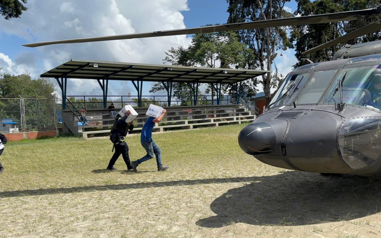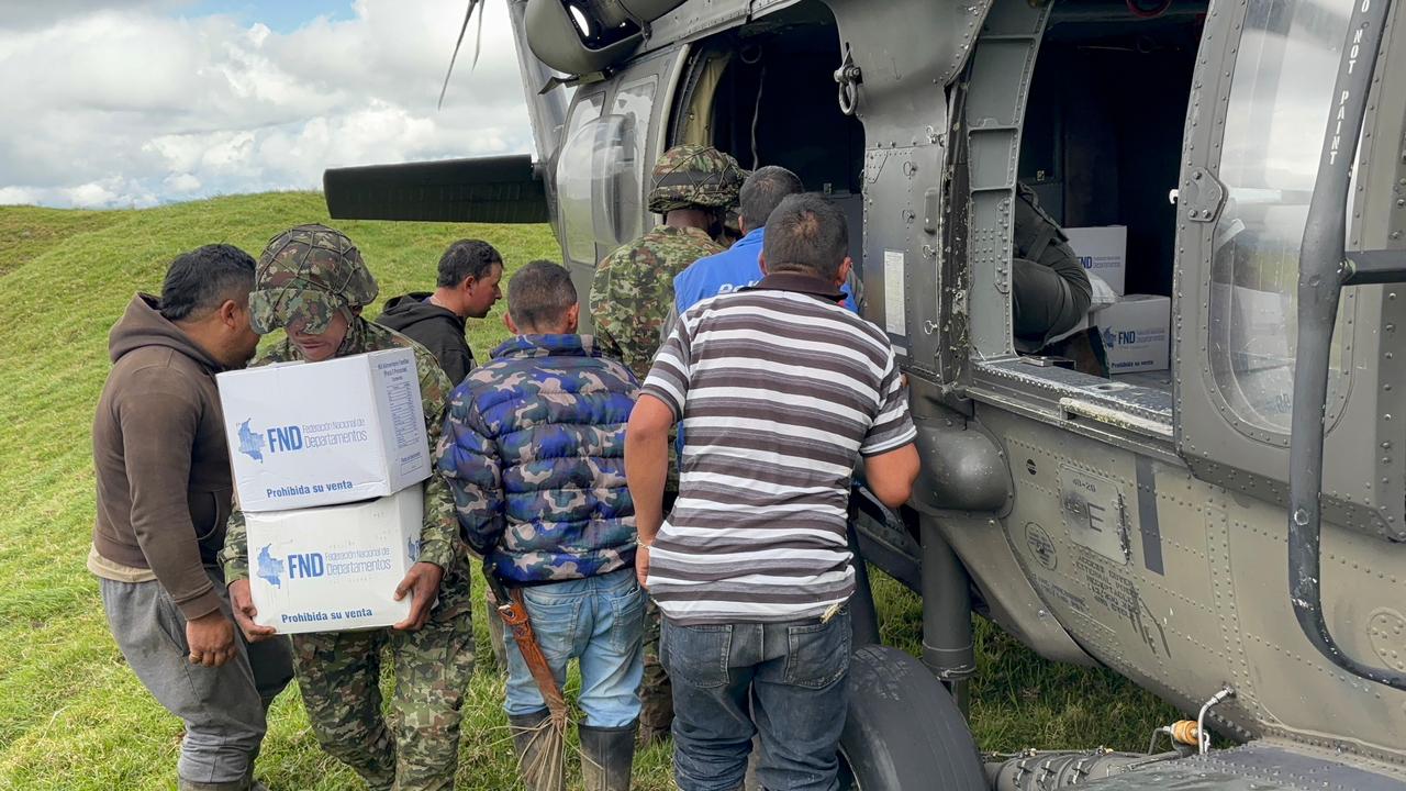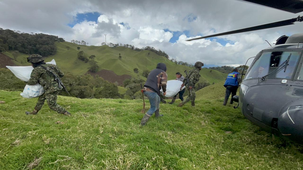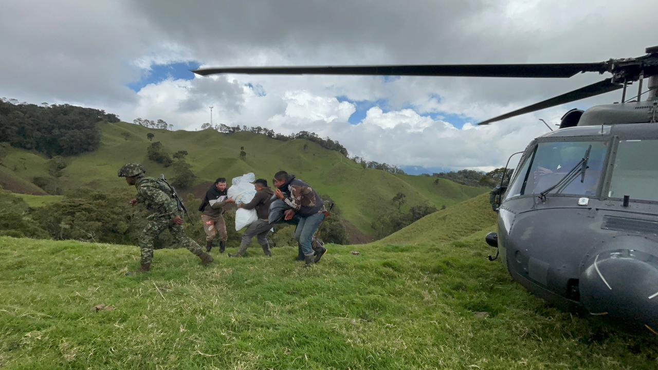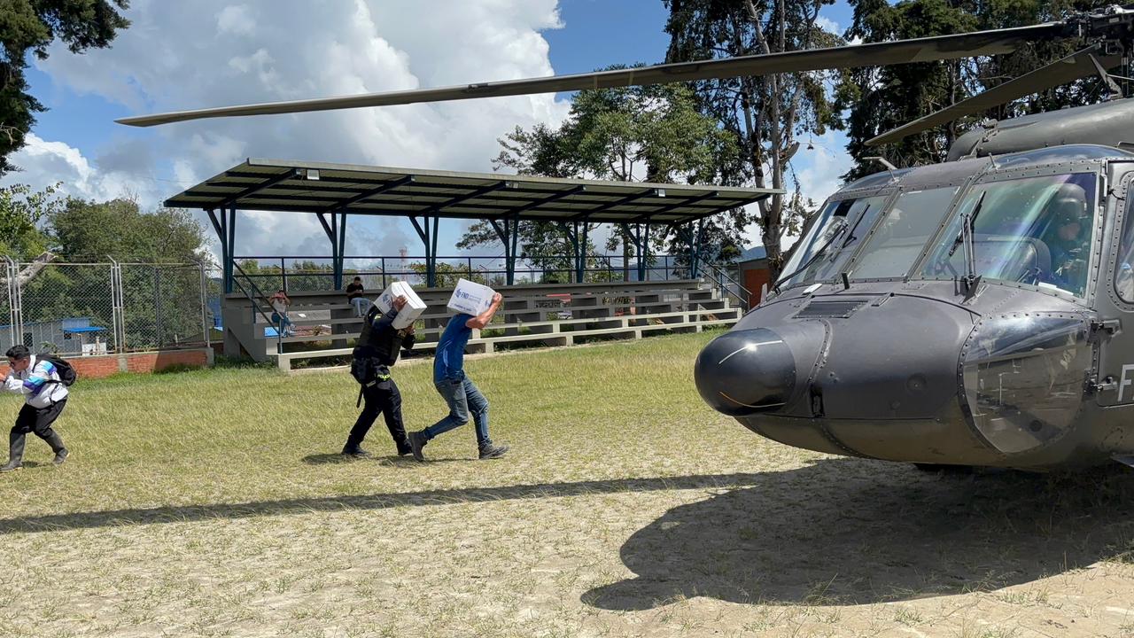 Como resultado, un helicóptero UH-60 Black Hawk del Comando Aéreo de Combate No. 5 fue dispuesto para transportar mercados, kits de aseo, agua potable y medicamentos, desde la cabecera municipal hacia la zona afectada, la operación contó con el acompañamiento del Ejército Nacional y del Comando Aéreo de Combate No. 4, lo que permitió articular esfuerzos en un área de difícil acceso.