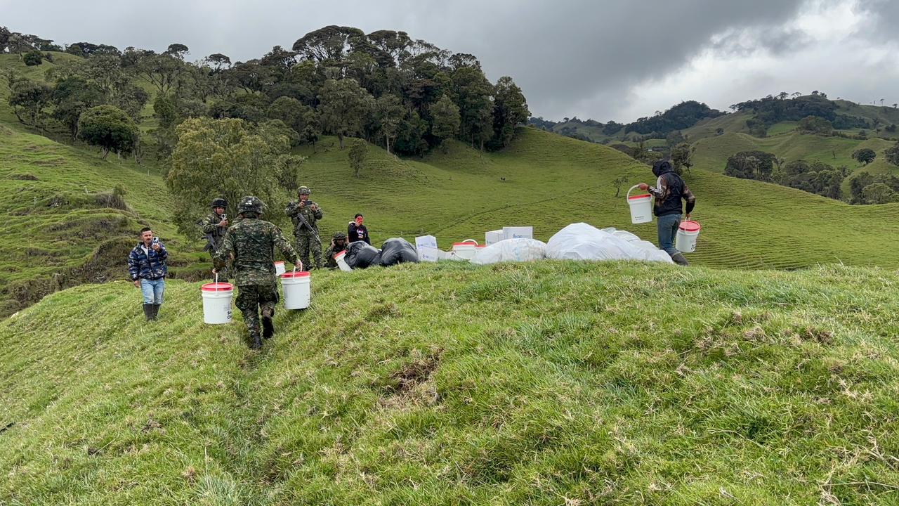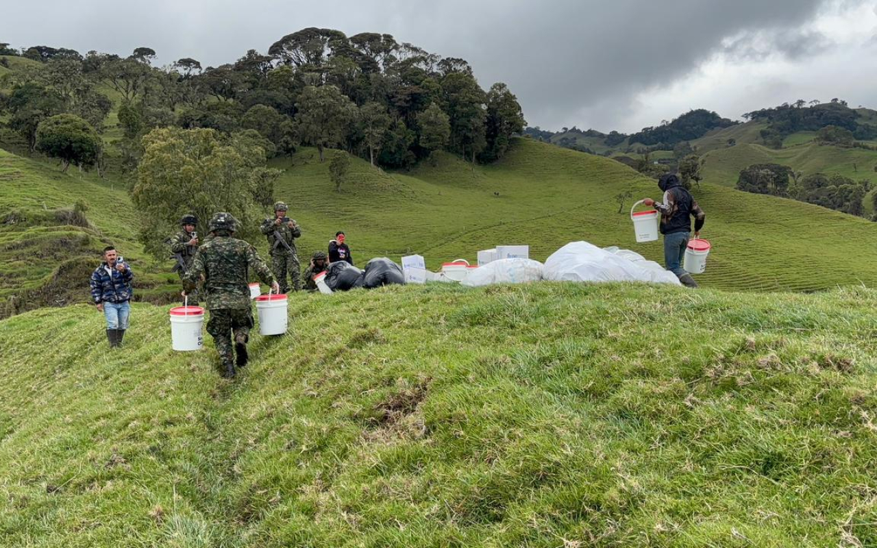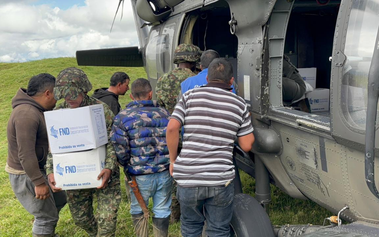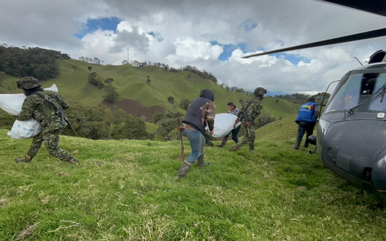 Como resultado, un helicóptero UH-60 Black Hawk del Comando Aéreo de Combate No. 5 fue dispuesto para transportar mercados, kits de aseo, agua potable y medicamentos, desde la cabecera municipal hacia la zona afectada, la operación contó con el acompañamiento del Ejército Nacional y del Comando Aéreo de Combate No. 4, lo que permitió articular esfuerzos en un área de difícil acceso.