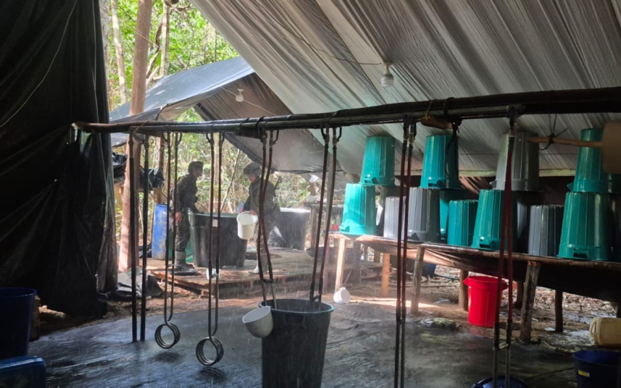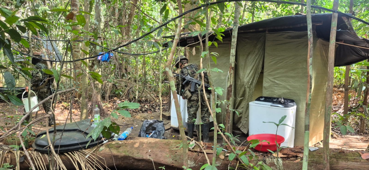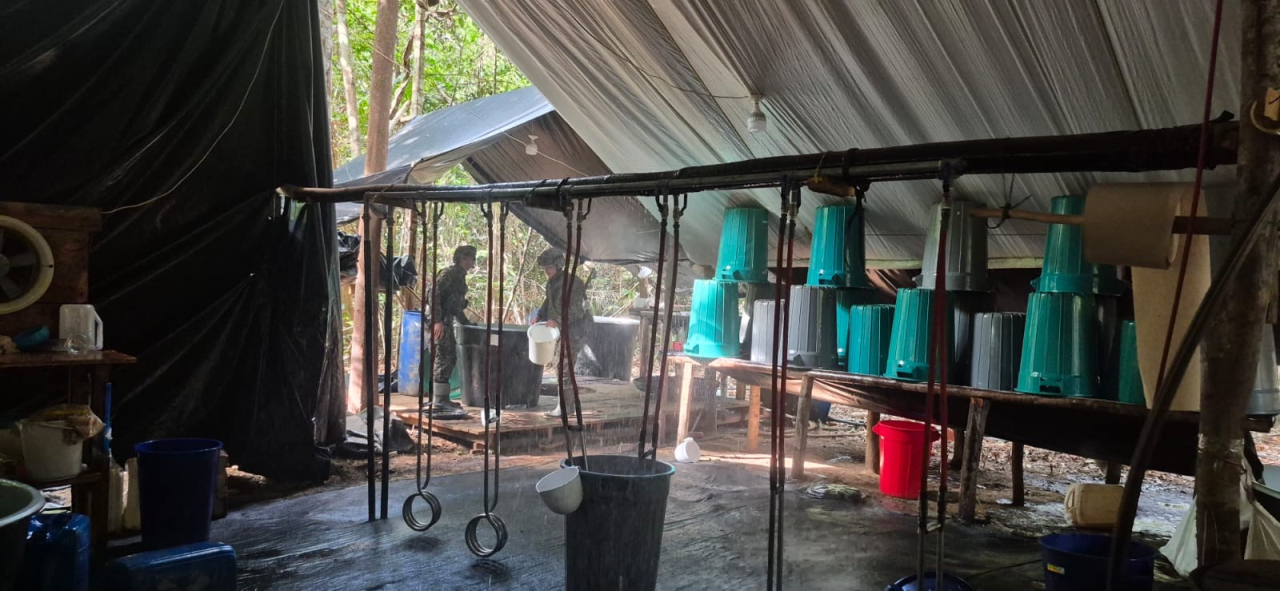 En el lugar fue destruido un laboratorio de cristalización de clorhidrato de cocaína y un laboratorio de pasta base de coca, PBC, además de diversos elementos empleados para el procesamiento de estupefacientes como 500 kilogramos de soda cáustica, 1.000 galones de gasolina, 500 kg de ácido sulfúrico, 200 kg de acetona y 200 kg de permanganato de potasio, entre otros insumos químicos, adicional al hallazgo de 100 etiquetas color negro con la marca 007.